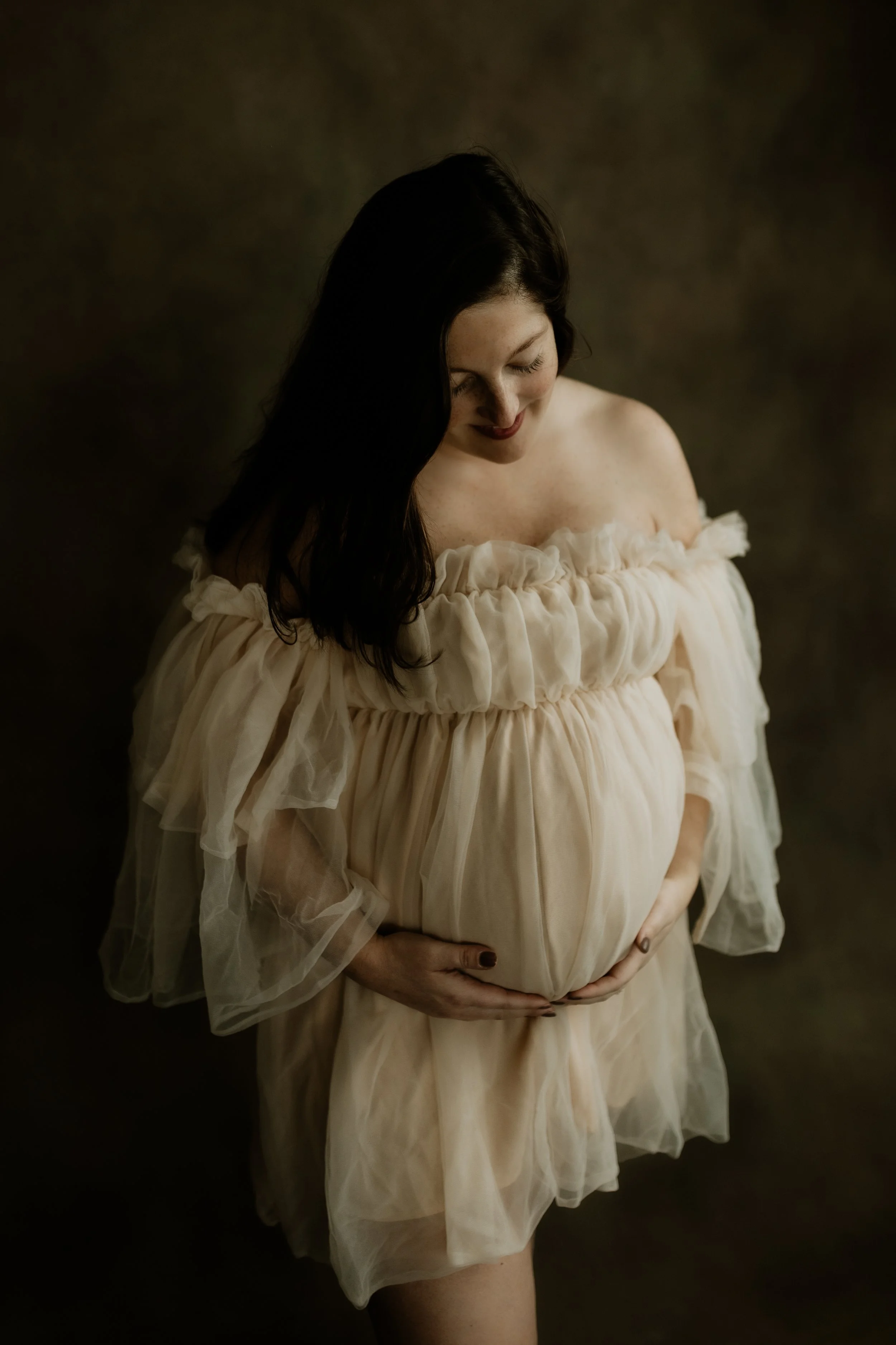 The first dress that I want to spotlight is a flowy off-the-shoulder boho, lace dress. This dress is perfect for a stylized, studio maternity sessio. The lace detailing adds a touch of elegance and femininity, while the off-the-shoulder design adds a touch of romance and sensuality. The flowy fabric of the dress adds a sense of movement and grace to the images, creating a beautiful and ethereal look.